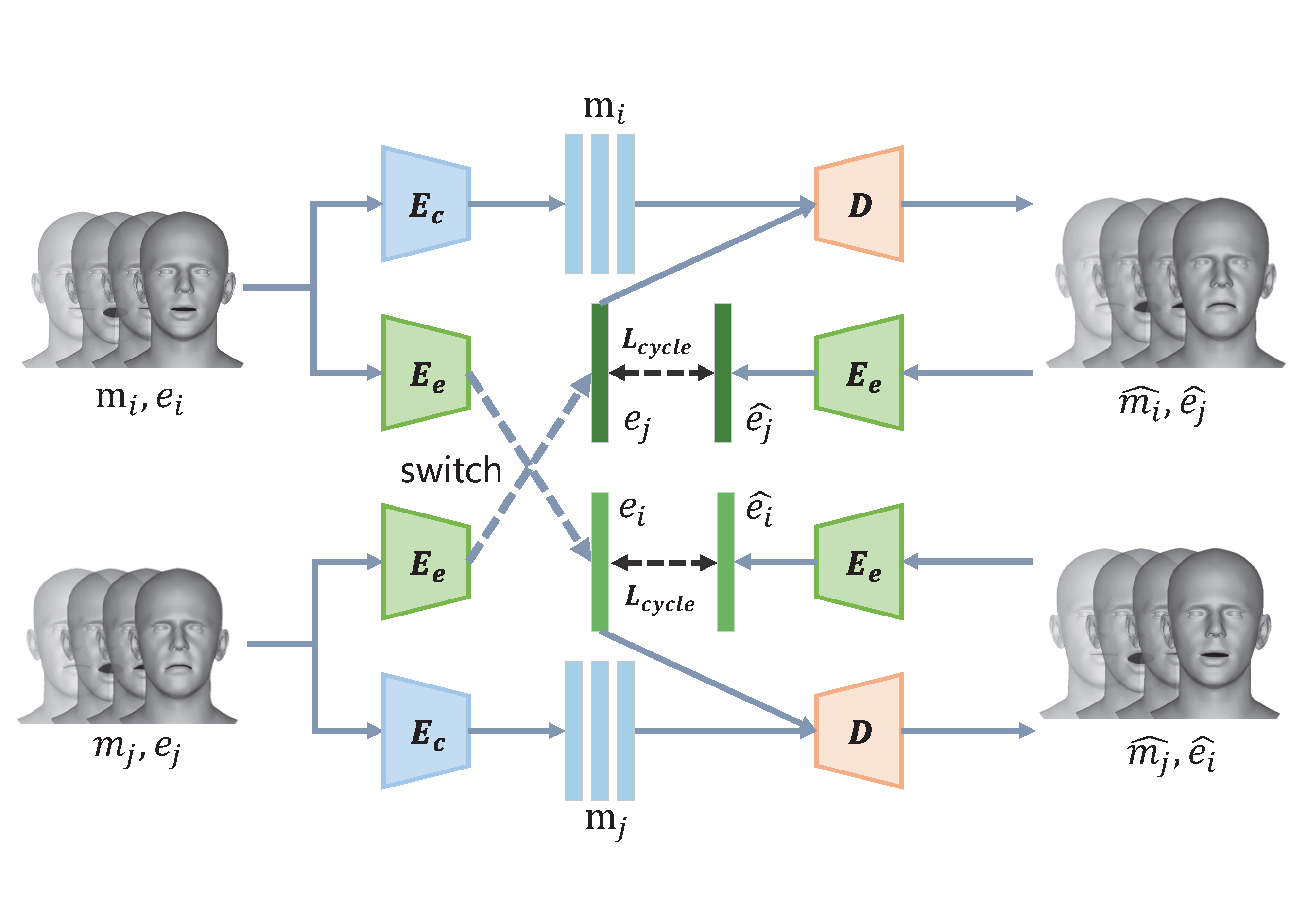 Emotion and content features are derived from facial motion inputs, switched and recombined to reconstruct corresponding outputs. This cyclic approach reduces the dependencies of specific paired training samples.