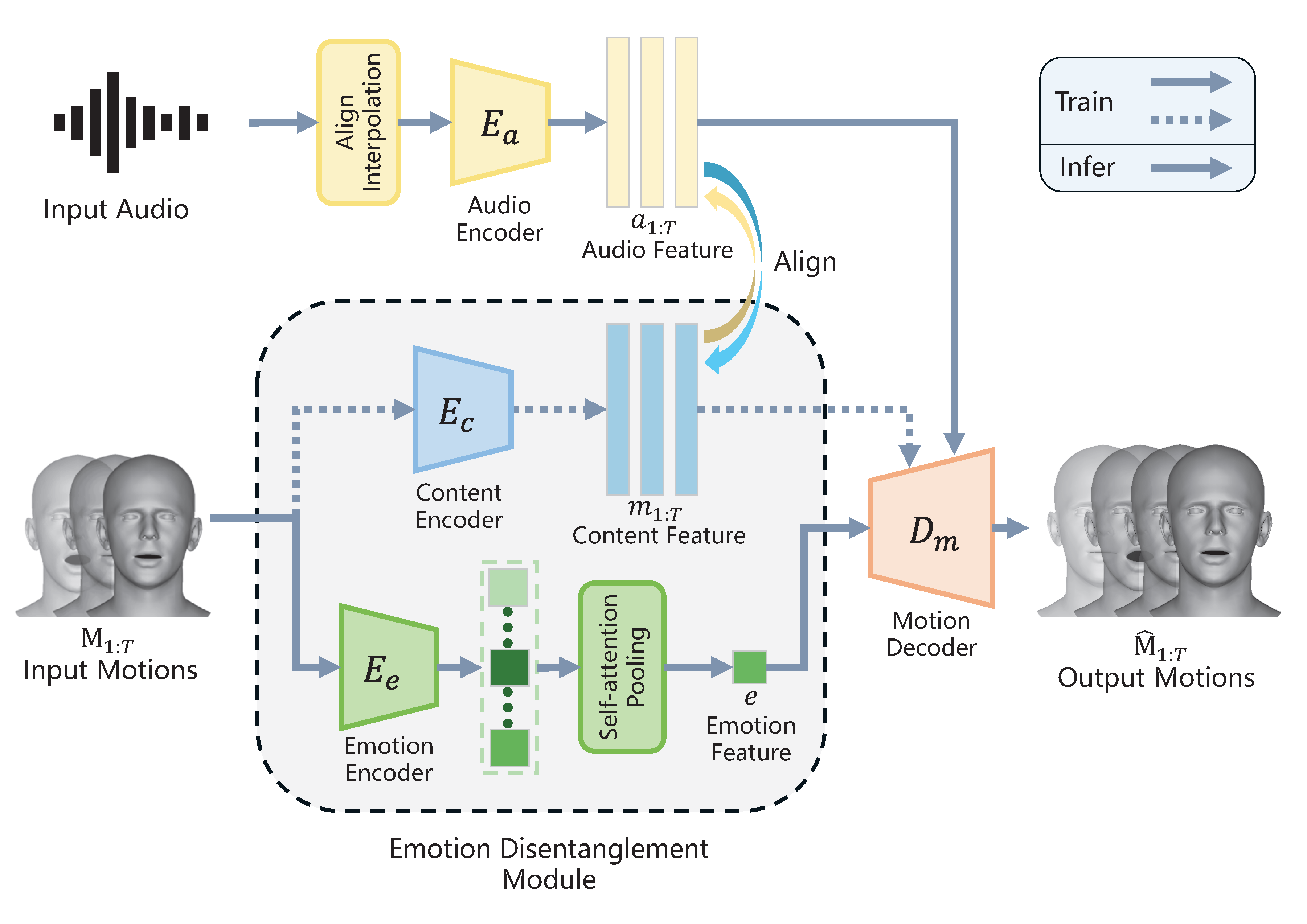 DisenEMO takes an audio sequence as content input and a facial motion sequence as emotional reference. Using facial motion as emotional source allows for accurate facial expression reconstruction.