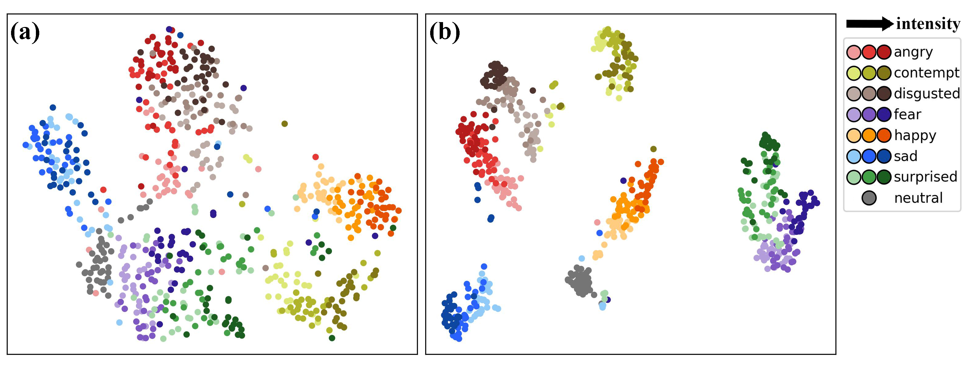 T-SNE visualization of emotion feature on MEAD-3D. (a) with triplet constraint, (b) without triplet constraint. Features are clustered according to emotional categories. Darker colors indicate higher emotion intensity.